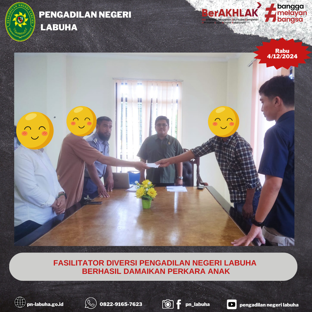 LABUHA—Fasilitator Diversi Pengadilan Negeri Labuha, Hakim Tingkat Pertama, Galang Adhe Sukma, S.H., M.H. berhasil mendamaikan para pihak dalam perkara anak, klasifikasi perkara lalu lintas yang terjadi pada tahun 2024 ini.