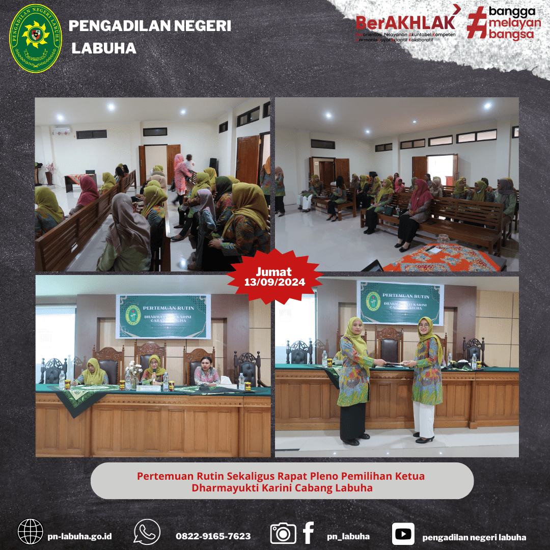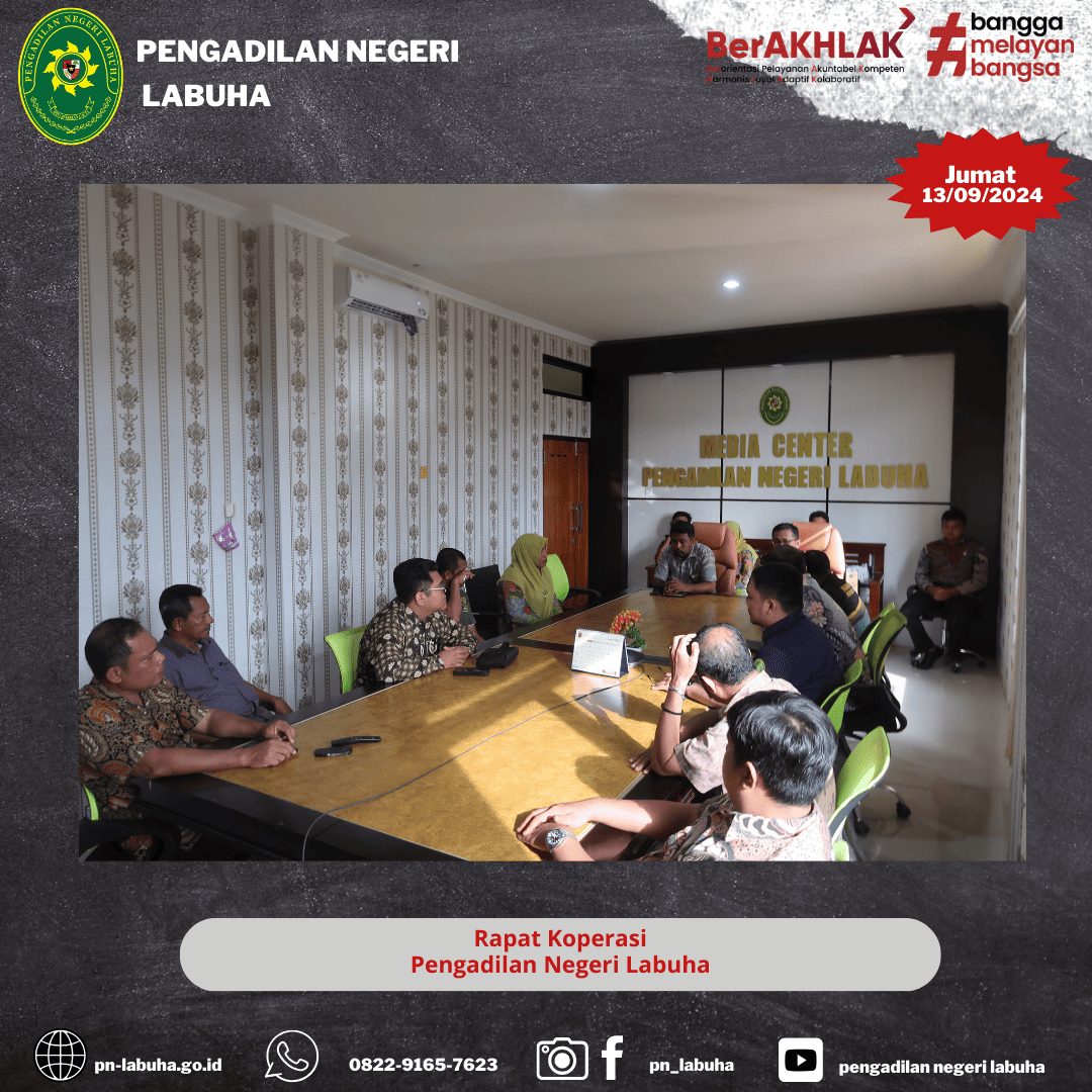 Labuha, 13 September 2024. Bertempat diruang Media Center, Pengadilan Negeri Labuha melaksanakan Rapat Pembahasan Mengenai Koperasi. yang dipimpin Oleh Wakil Ketua Pengadilan Negeri Labuha Bapak. Wahyudinsyah Panjaitan, S.H., M.Hum, Diikuti Oleh Para Hakim, Panitera, Sekertaris, Pejabat Struktural/Fungsional, Pegawai Beserta PPNPN