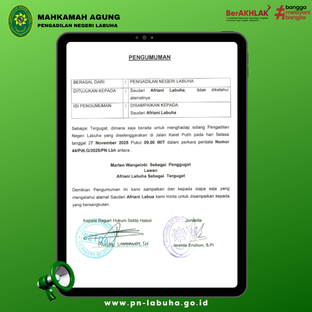 Relaas Panggilan Umum Kepada Tergugat Atas Nama Afriani Labuha Dengan Nomor Perkara Perdata Nomor 44/Pdt.G/2025/PN Lbh