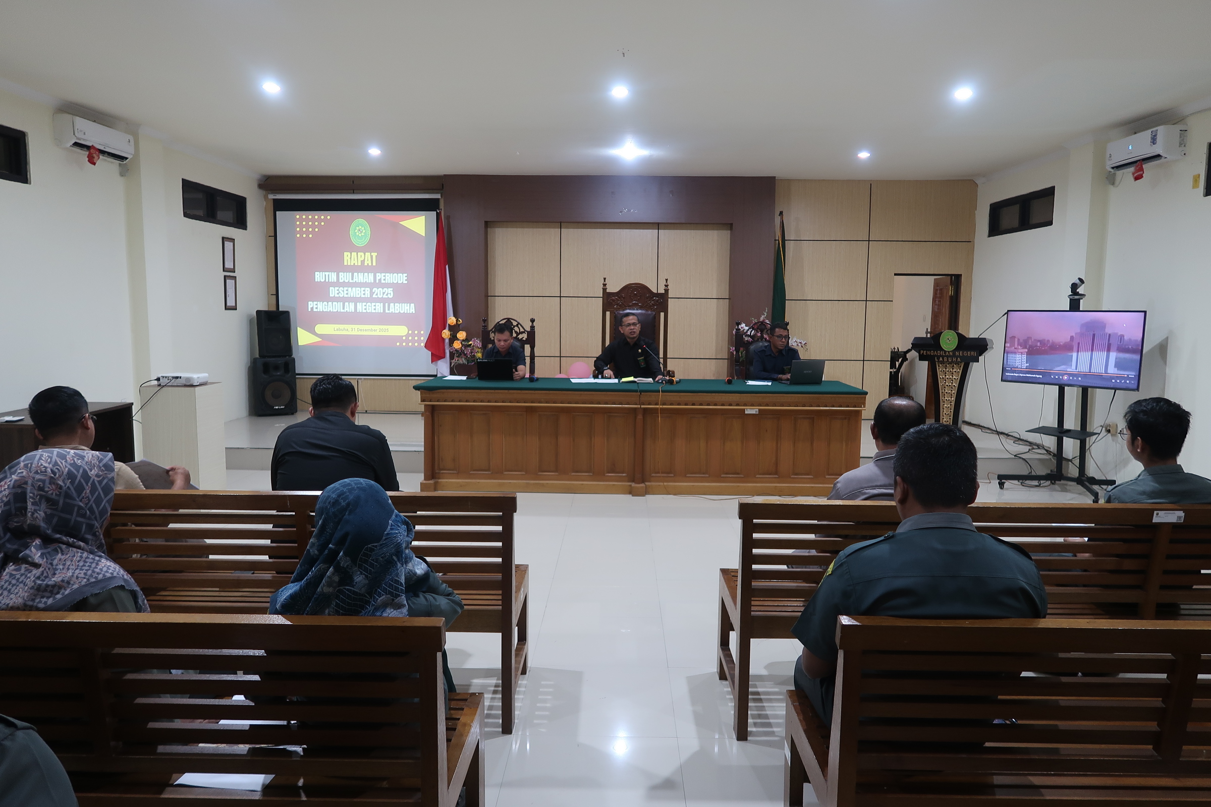 Pengadilan Negeri Labuha melaksanakan Rapat Rutin Bulanan Periode Desember 2025 pada Rabu, 31 Desember 2025, bertempat di ruang rapat lantai II Pengadilan Negeri Labuha. Rapat tersebut dipimpin langsung oleh Ketua Pengadilan Negeri Labuha, di dampingi oleh Panitera dan sekretaris. dihadiri oleh para hakim, pejabat struktural dan fungsional, serta seluruh aparatur Pengadilan Negeri Labuha.