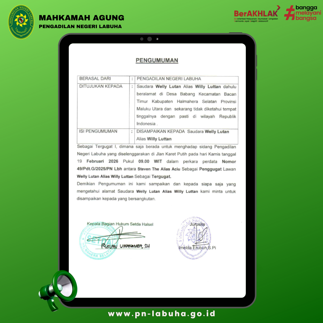 Relaas Panggilan Umum Kepada Tergugat I Atas Nama Welly Lutan Alias Willy Luttan Dengan Nomor Perkara Perdata Nomor 49/Pdt.G/2025/PN Lbh