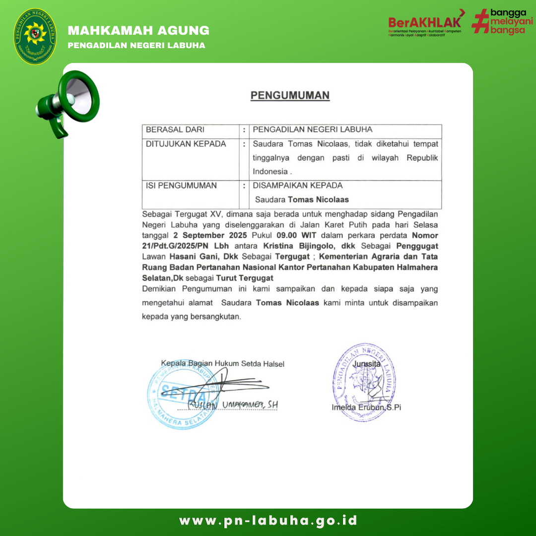 BerandaLayananPengumumanPengumuman TerkiniRelaas Panggilan Umum Kepada Tergugat XV Atas Nama Tomas Nicolaas Dengan Nomor Perkara Perdata Nomor 21/Pdt.G/2025/PN Lbh