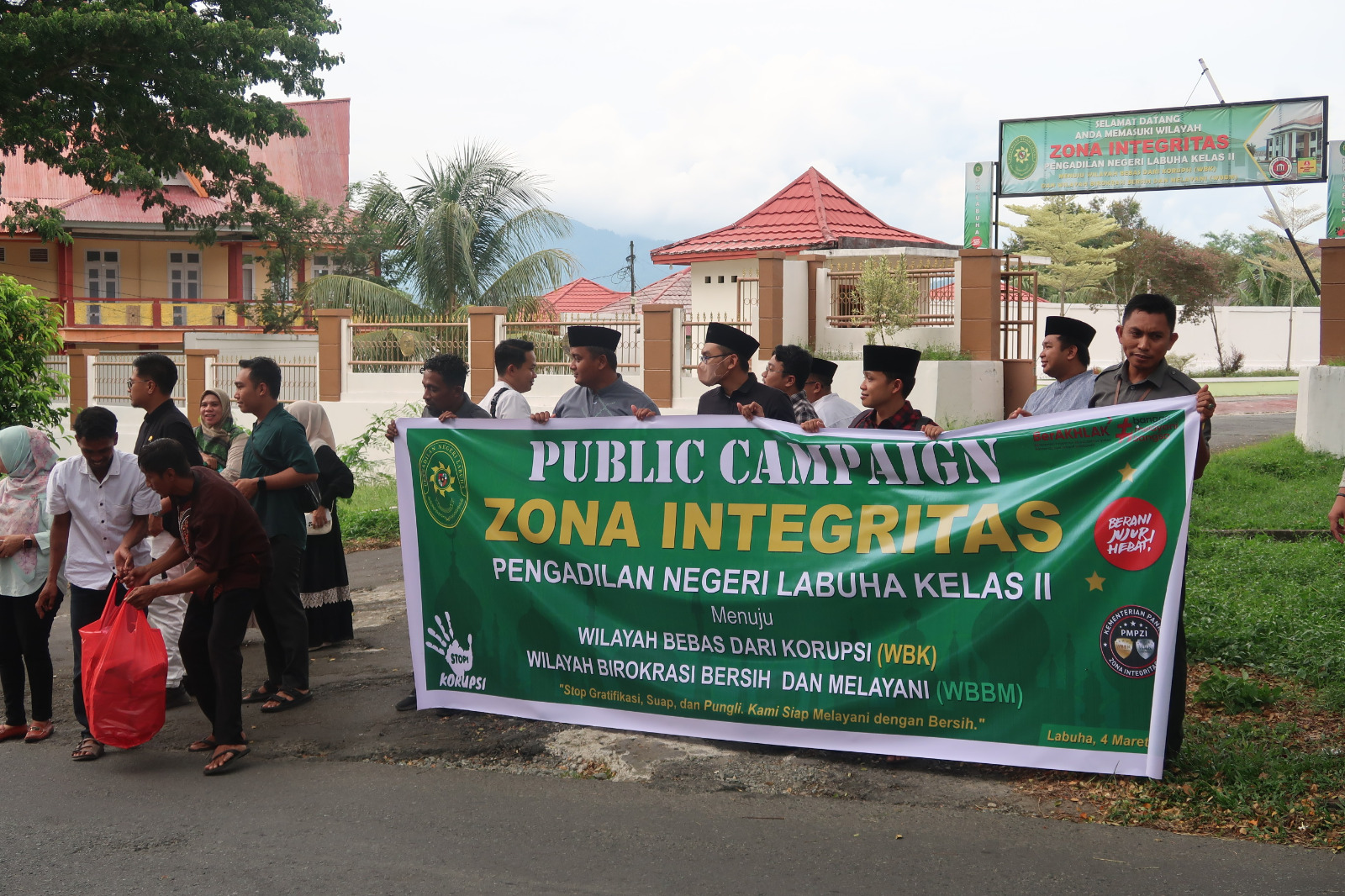 Kegiatan Public Campaign dilaksanakan di lingkungan kantor Pengadilan Negeri Labuha dengan melibatkan pimpinan, hakim, pegawai, serta jajaran PPNPN. Dalam kegiatan tersebut, para aparatur membentangkan spanduk bertuliskan komitmen pembangunan Zona Integritas serta mengajak masyarakat untuk bersama-sama mendukung upaya pemberantasan korupsi.