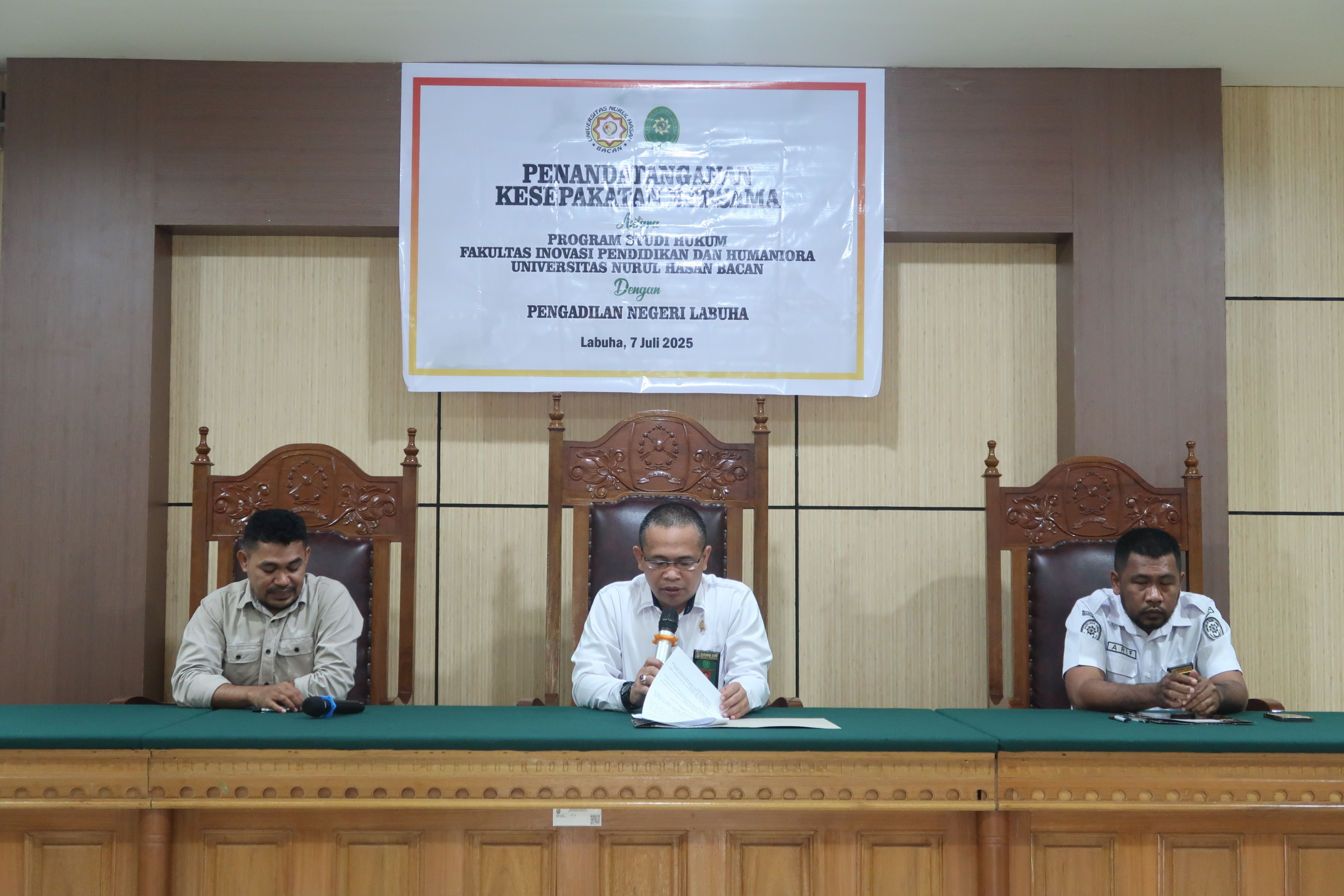 PENANDATANGANAN KESEPAKATAN  BERSAMA ANTARA PROGRAM STUDI HUKUM FAKULTAS INOVASI PENDIDIKAN DAN HUMANIORA  UNIVERSITAS NURUL HASAN BACAN DENGAN  PENGADILAN NEGERI LABUHA