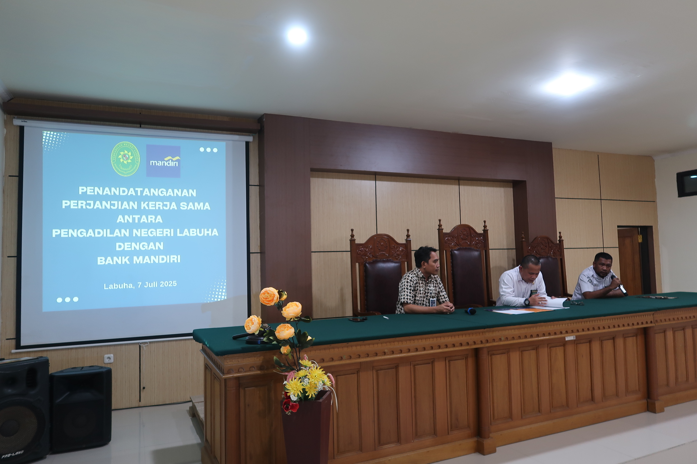 Labuha, 7 Juli 2025 — Pengadilan Negeri Labuha resmi menjalin kerja sama dengan Bank Mandiri Cabang Labuha melalui penandatanganan perjanjian kerja sama yang dilaksanakan pada Senin, 7 Juli 2025, bertempat di ruang sidang Rapat Pengadilan Negeri Labuha.
