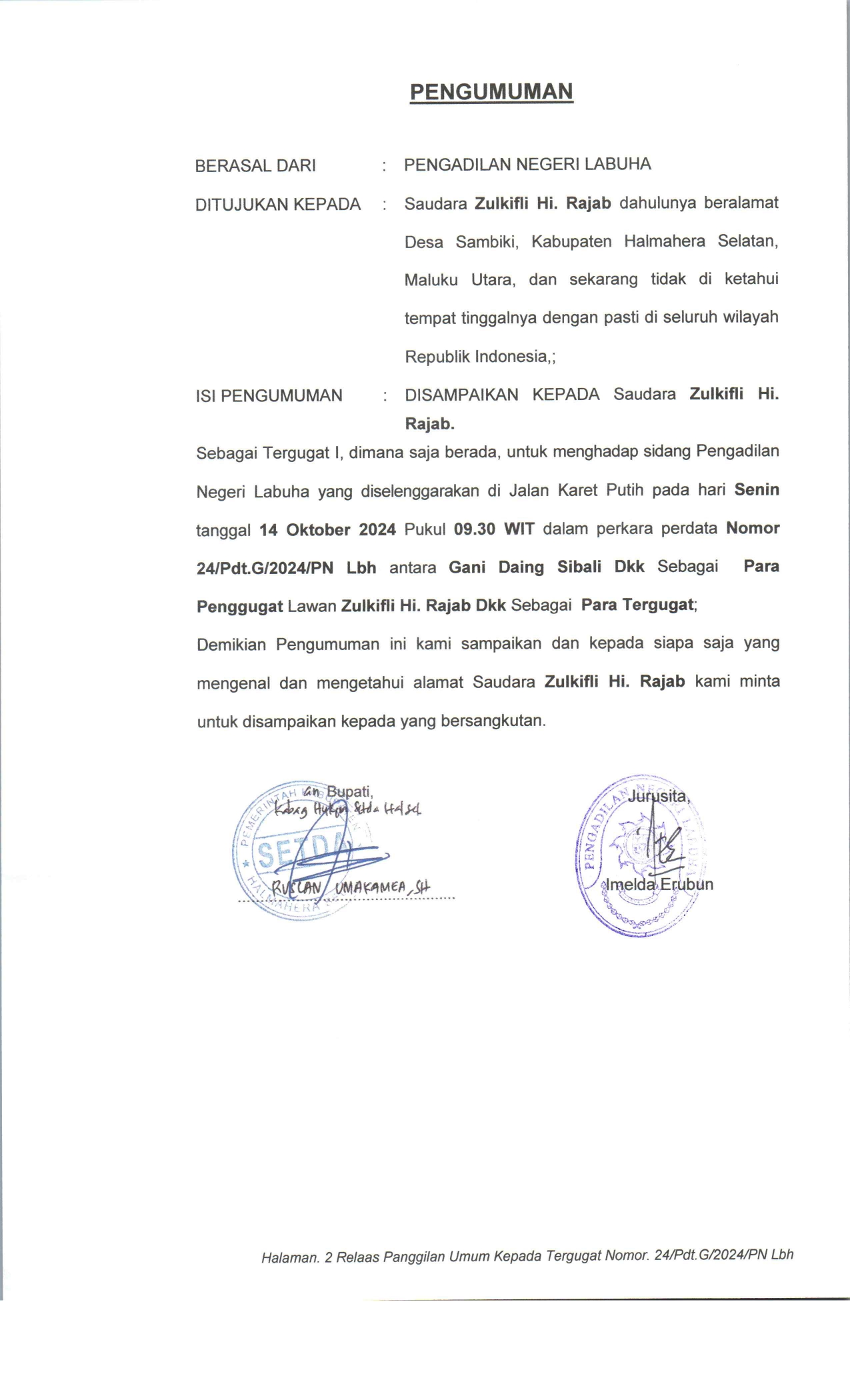 Relaas Panggilan Umum Kepada Tergugat Atas Nama Zulkifli Hi. Rajab dengan Perkara Perdata 24/Pdt.G/2024/PN Lbh