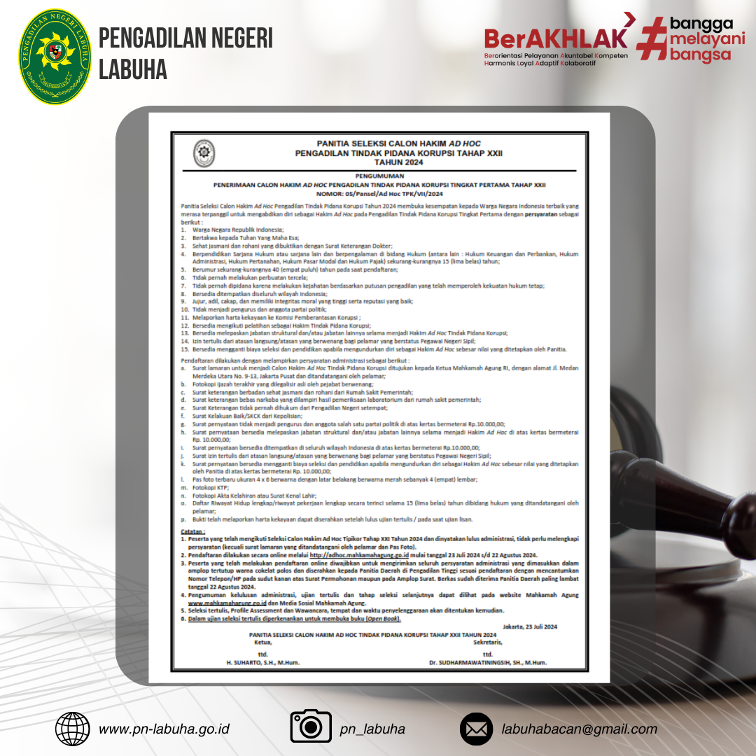 Pengumuman Penerimaan Calon Hakim Ad Hoc Tindak Pidana Korupsi Tingkat Pertama Angkatan XXII Tahun 2024 Informasi selengkapnya di : www.mahkamahagung.go.id
