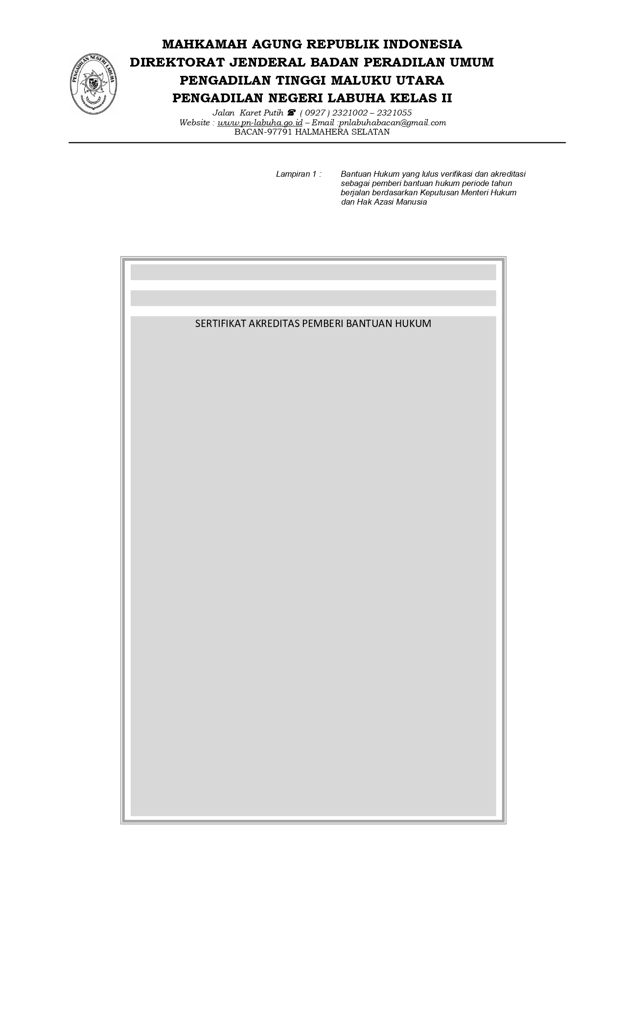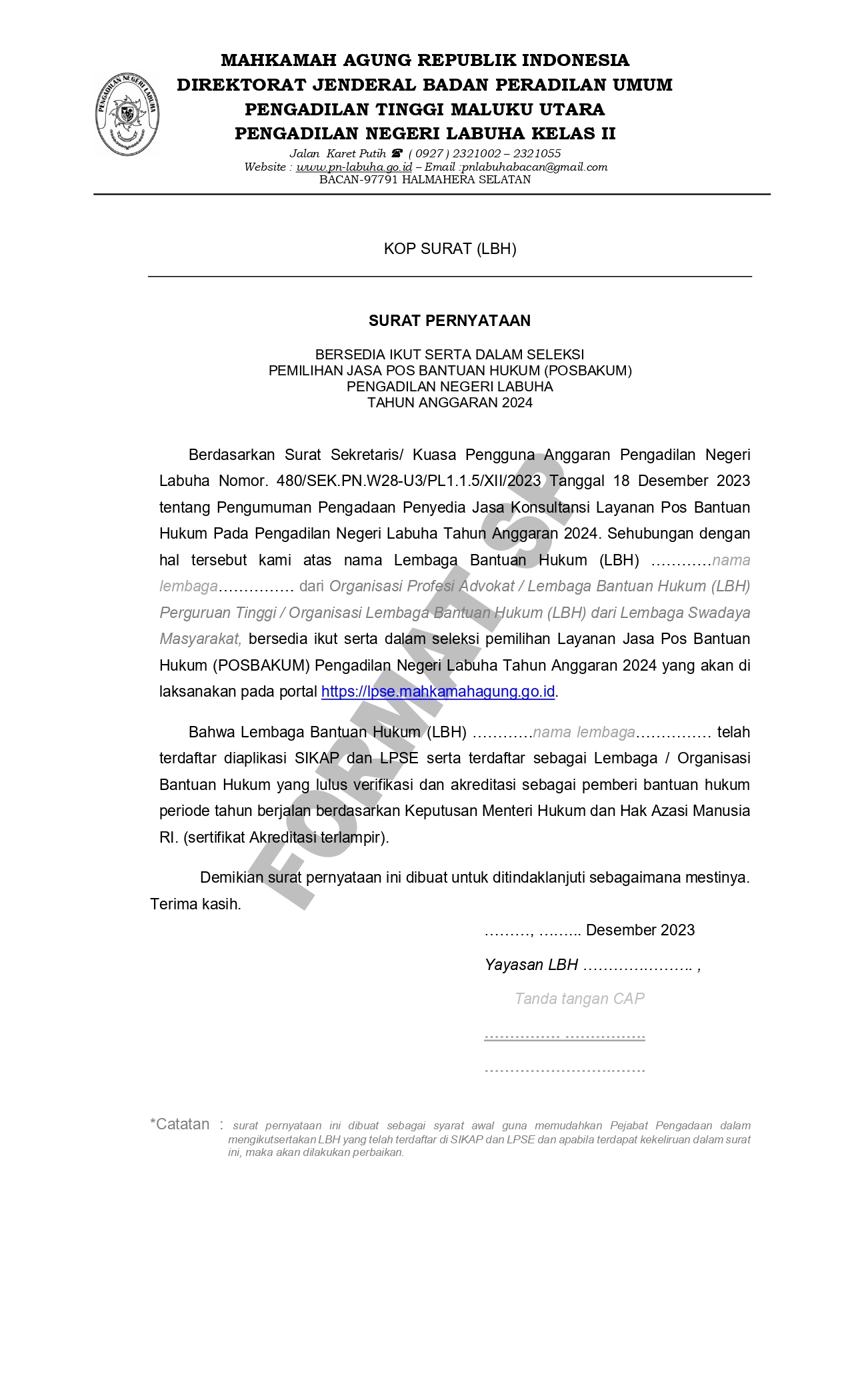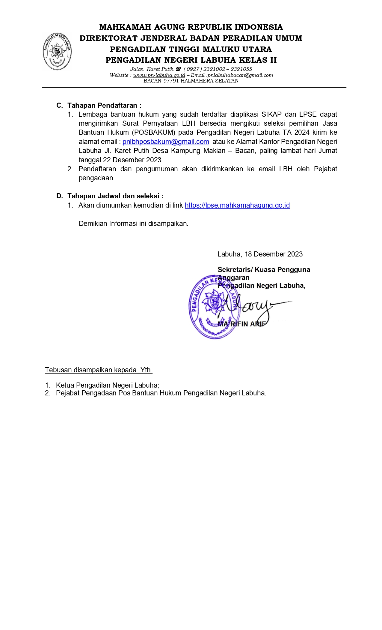 18 Desember 2023 Pengadaan Penyedia Jasa Konsultasi Layanan Pos Bantuan Hukum Pada Pengadilan Negeri Labuha Tahun Anggaran 2024 on Senin, 18 Desember 2023. Posted in Pengumuman Terkini LINK DOKUMEN Continue Reading