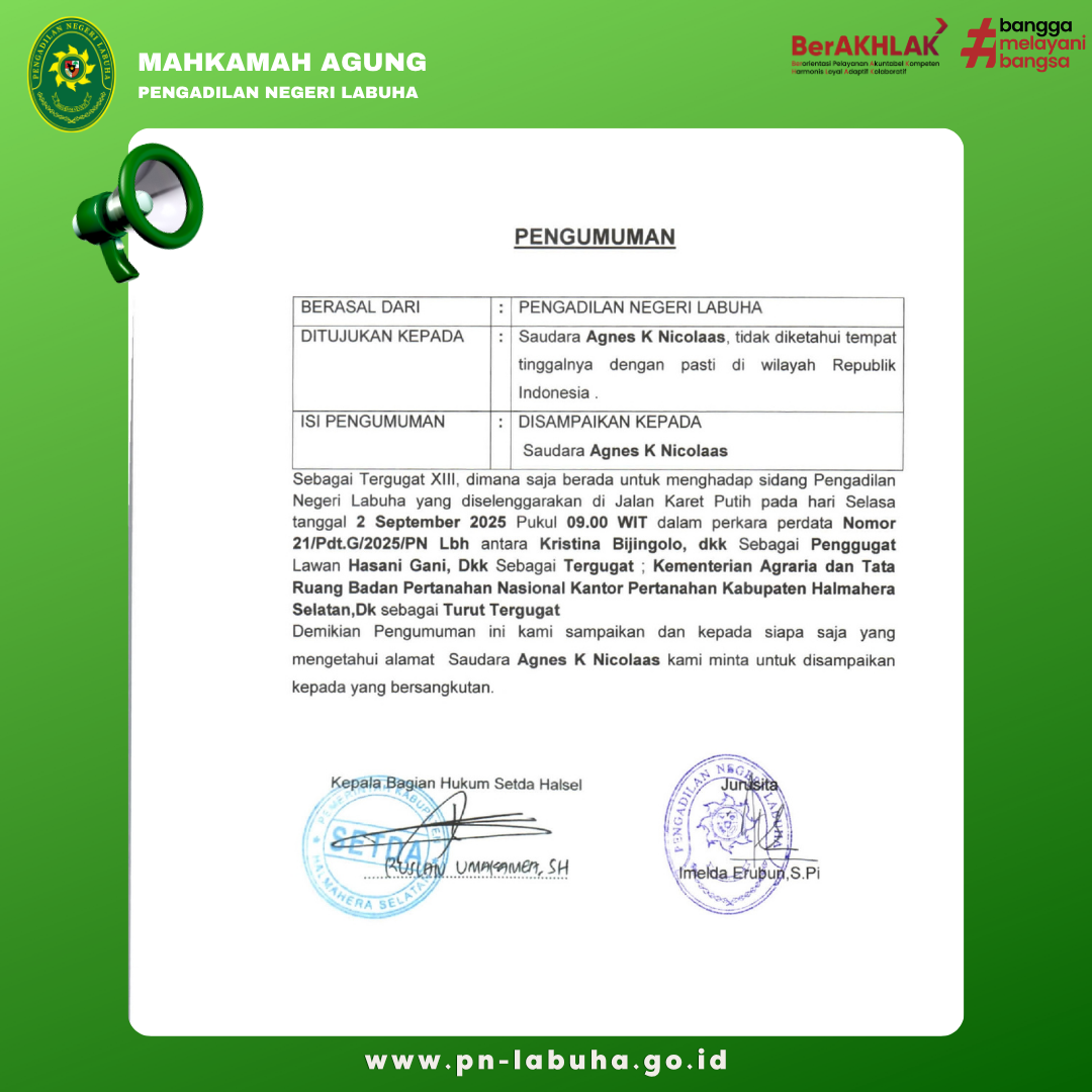 Relaas Panggilan Umum Kepada Tergugat XIII Atas Nama Agnes K Nicolaas Dengan Nomor Perkara Perdata Nomor 21/Pdt.G/2025/PN Lbh