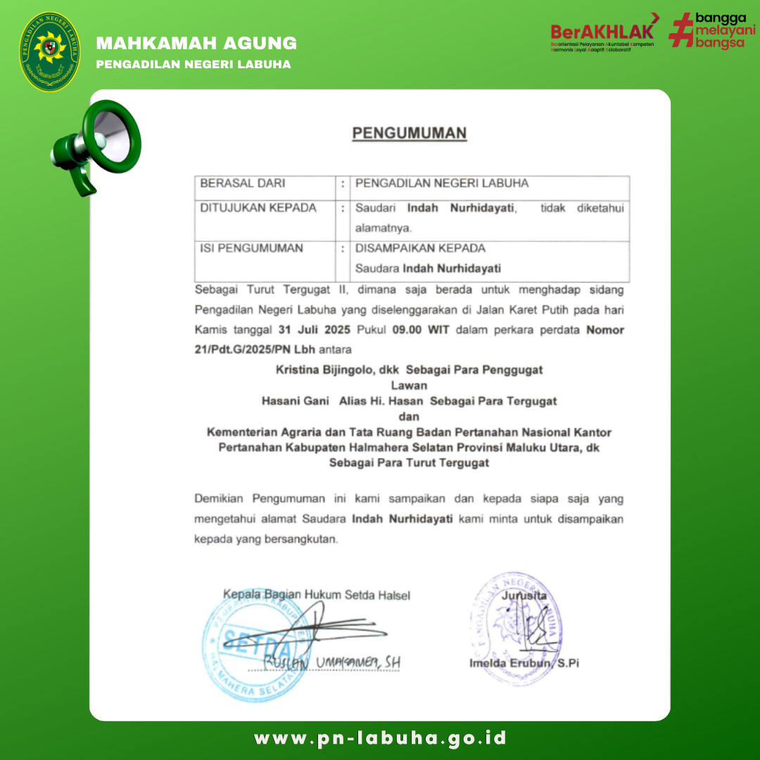 Relaas Panggilan Umum Kepada Turut Tergugat II Atas Nama Indah Nurhidayati Dengan Nomor Perkara Perdata Nomor 21/Pdt.G/2025/PN Lbh