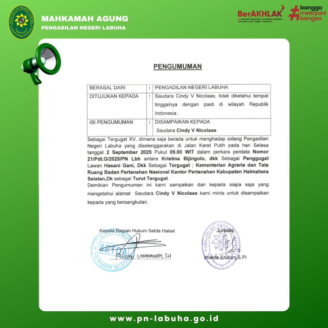 Relaas Panggilan Umum Kepada Tergugat XV Atas Nama Cindy V Nicolaas Dengan Nomor Perkara Perdata Nomor 21/Pdt.G/2025/PN Lbh